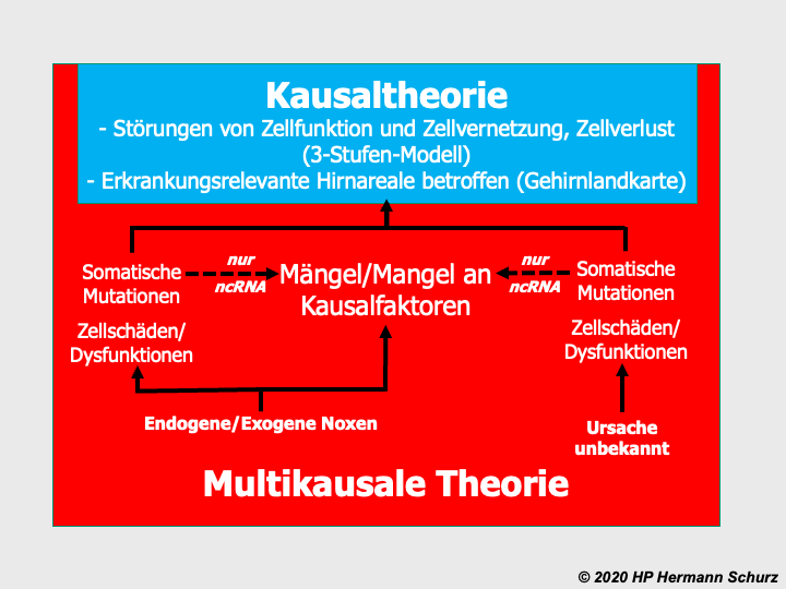 Die Überlegungen werden anhand einer an die jeweilige Erkrankung modifizierten Kausaltheorie durchgeführt, die sowohl die Mikro- als auch Makrobetrachtung und das Drei-Stufen-Modell betreffen. Endogene und exogene Einflüsse werden berücksichtigt und bewertet im Sinne einer multikausalen Erweiterung.