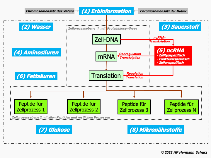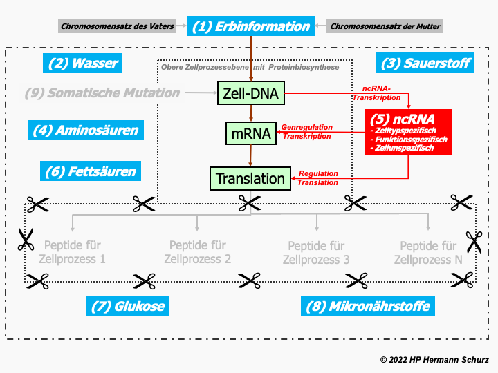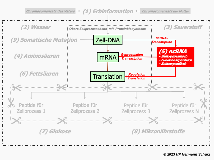 Die Gruppe der nicht‑codierenden Ribonukleinsäuren (ncRNA) hat die höchste zellphysiologische Relevanz unter den Kausalfaktoren. Die ncRNA‑Moleküle werden nicht ‑ wie die anderen stoffwechselaktiven Kausalfaktoren ‑ über Nahrung oder Atmung zugeführt, sondern in gesunden Zellen bedarfsgerecht durch Transkription synthetisiert.