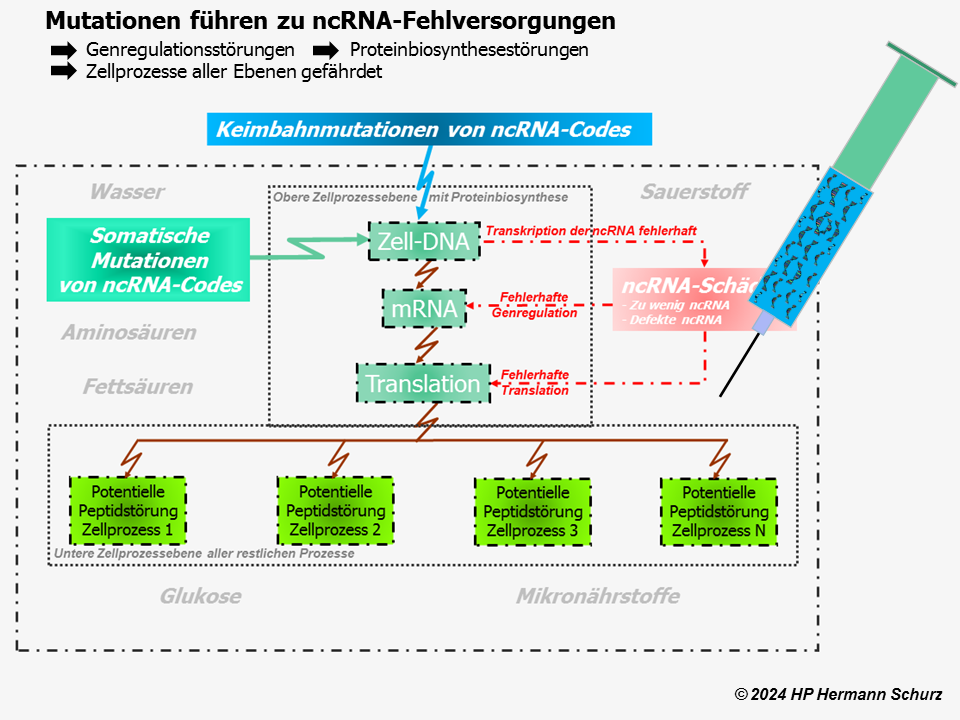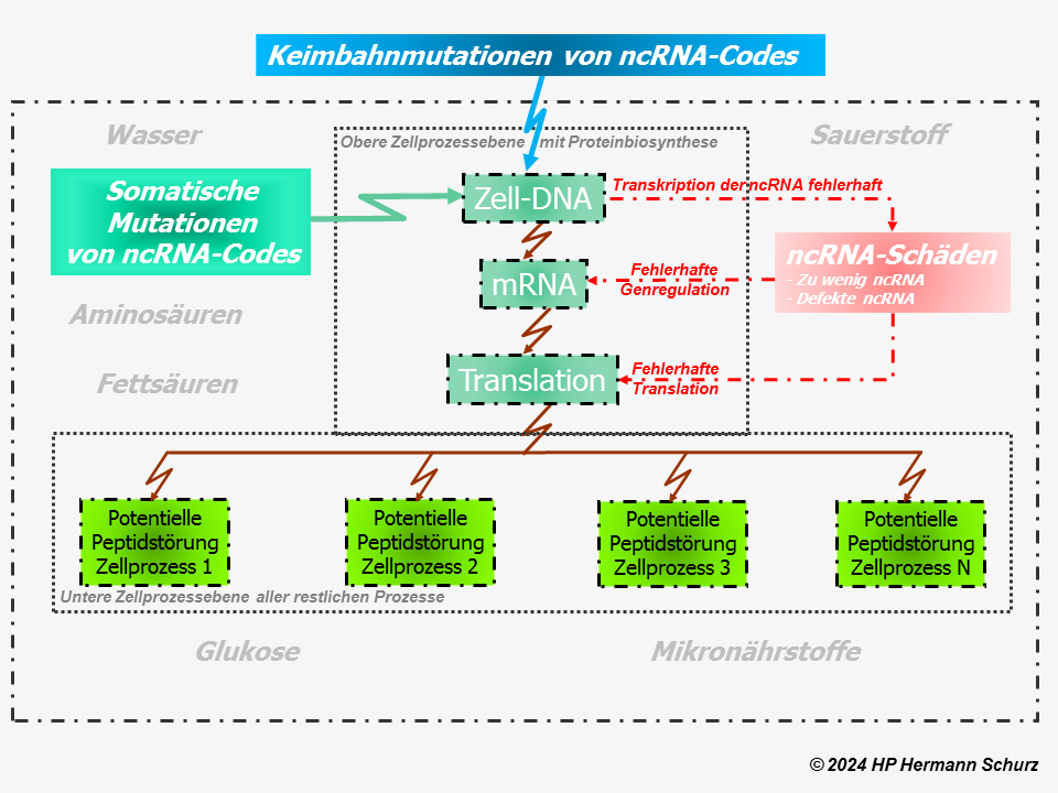 Entscheidend sind aber ausschließlich Veränderungen von Gen‑ oder ncRNA‑Codes an der DNA‑Vorlage, denn nur sie haben das Potential, sich dauerhaft zu manifestieren und den Zellstoffwechsel langfristig zu schädigen. Die Problematik von mRNA-Schäden aufgrund physiologischer Vorgänge oder der Informationsübertragung spielt im Zellprozessmodell daher keine Rolle.