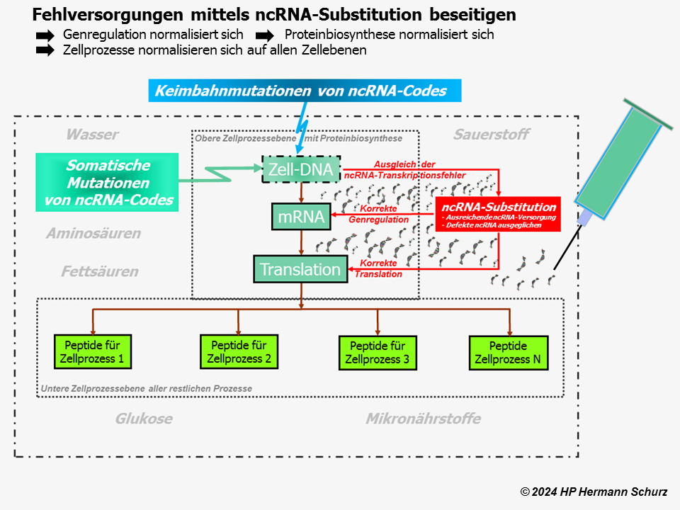 Die Strategie der ncRNA-Substitutionstherapie kann allegorisch mit dem Bild von der Paste beschrieben werden, die in der Tube bleiben muss, weil man sie nicht mehr dorthin zurückbekommt. So schafft eine durch Genregulationsfehler primär gestörte Proteinbiosynthese unzählige Probleme auf der unteren Zellprozessebene, die von dort aus nachträglich nicht mehr oder maximal unzulänglich korrigiert werden können. Daher muss dafür Sorge getragen werden, dass die übergeordnete Proteinbiosynthese optimal durchgeführt wird, und die „Paste in der Tube bleibt“. Dagegen wird mit den meisten konventionellen Therapiekonzepten versucht, durch Interventionen auf der unteren Prozessebene die „Paste wieder in die Tube zu drücken“, was aber nicht gelingen kann.