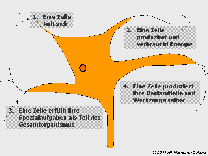 Ein geeignetes Zellmodell vereinigt die vier Basisprozessbereiche von Kern‑ und Zellteilung, Proteinbiosynthese mit Transkription und Translation, Energieversorgung und Spezialfunktionen und die für den Zellbetrieb notwendigen Basissubstanzen auf einfache Weise.
