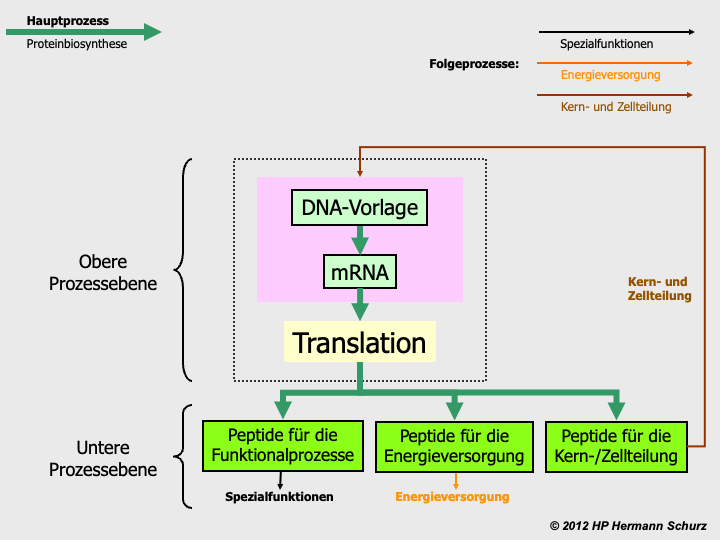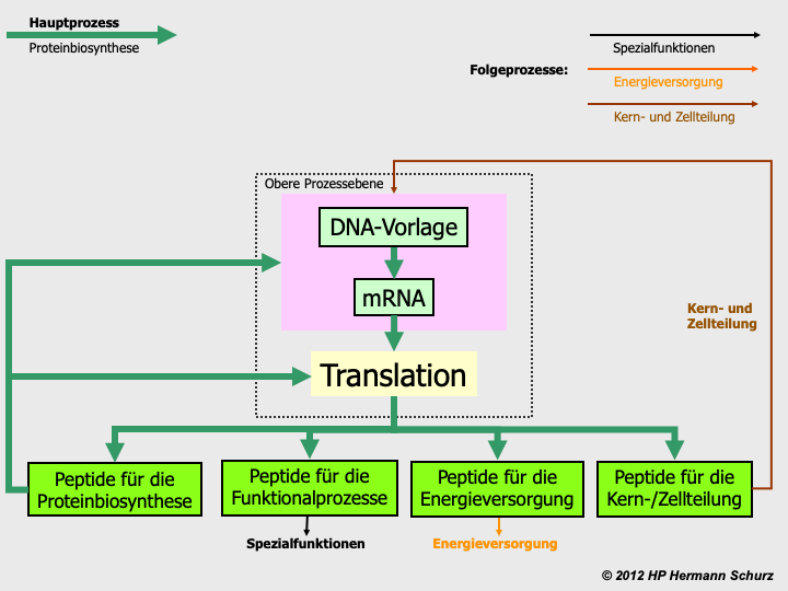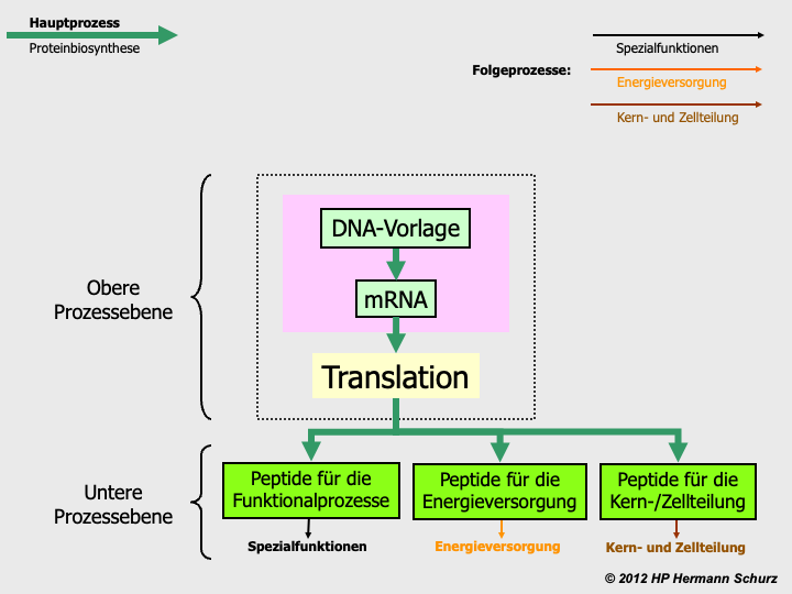 Zellen benötigen für sämtliche Aktivitäten Peptide in Form von Enzymen und Proteinen, die durch Transkription und den sich anschließenden Translationsprozess entstehen. Dieser elementare Vorgang der Proteinbiosynthese findet auf einer allen restlichen Prozessen übergeordneten Prozessebene statt. Die Ergebnisse der Proteinbiosynthese ‑ also sämtliche Peptide und die unmittelbar daraus resultierenden Prozesse Kern‑ und Zellteilung, Energieversorgung und Spezialfunktionen ‑ befinden sich demgegenüber auf der unteren Prozessebene, wie die folgende Abbildung 8 verdeutlich.